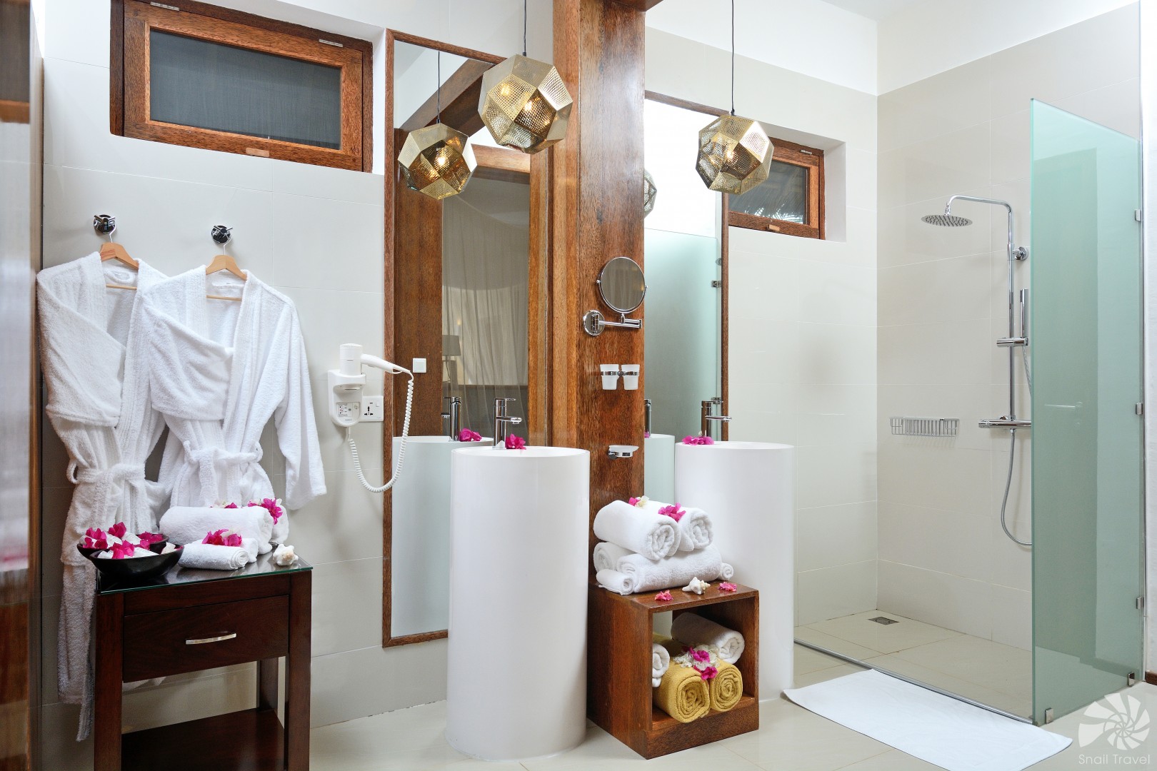Soukromá hotelová pláž s jemným bílým pískem, lemovaná kokosovými palmami, plážový servis.